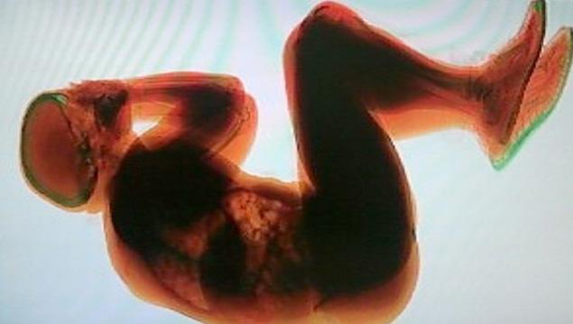 The picture that you see is an X-ray of a unnamed 36 year old Norwegian man who passed out and curled up into a fetal position on a baggage claim belt at a very busy Rome airport in August 2012, and inadvertently received this full body scan in the process.